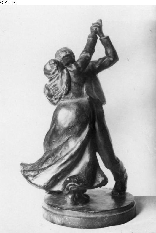 Ein bäuerliches Paar, im Tanz sich umarmend und in drehender Bewegung rechtsherum.