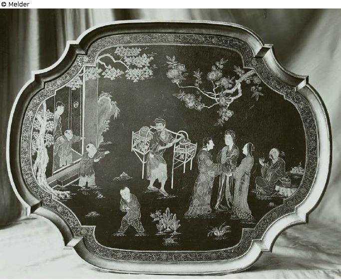 Teebrett bzw. Teetischplatte oval mit geschweiftem Rand. Er/sie zeigt neun Personen im "chinesischen" Stil sowie feines Band- und Laubwerk. Laut Arp-Aubert (1936) ist die Platte rot-gold lackiert.