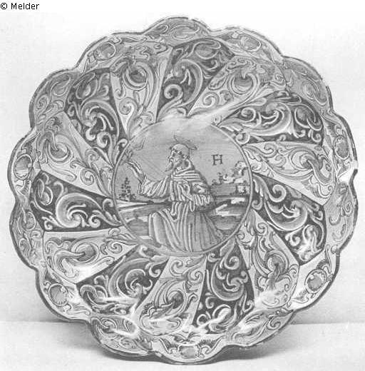 A FAENZA " SCANNELLATO " MOULDED DISH, by Virgiliotto Calamelli da Faenza, painted on the convex centre with a kneeling figure of St. Francis receiving the stigmata from a cherub, his hands, head and feet enriched with yellow and behind him the monogram " F.H. ", within orange and blue spirally moulded borders and green and yellow shaped rim, painted with grotesche motifs in lavender blue and white, the underside plain which is unusual in these " scannellato " dishes, the foot with the mark " . B . ", circa 1540
