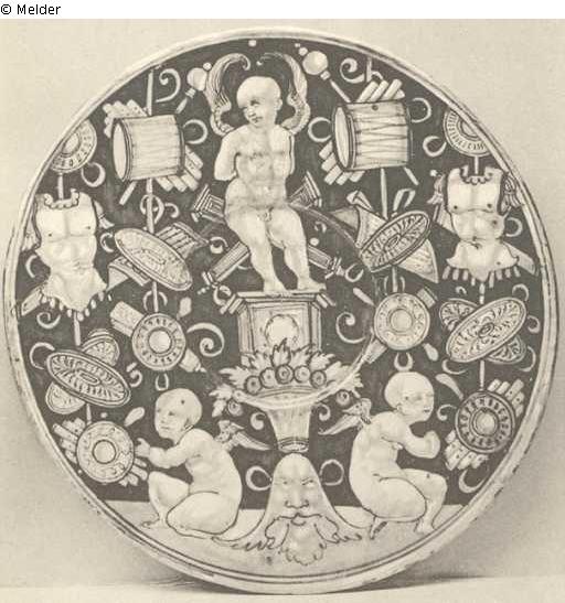 A RARE CASTEL DURANTE PLATE, by Giovanni Maria, with a rich blue ground, decorated with two kneeling figures of bald-headed cupids flanking a mask and surmounted by another full-length figure of a cupid on a pedestal, this figure is flanked by numerous trofei including drums and cuirasses in yellow, orange, pale blue and pale green, the underside with roughly executed foliate scrolls and a blue border round the rim, circa 1515