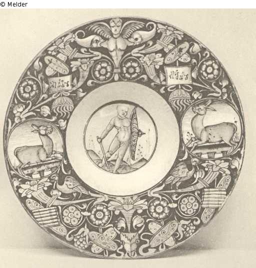 A RARE CASTEL DURANTE TONDINO, by Giovanni Maria, the sunk centre with a full-length figure of a putto in blue holding a yellow sword and shield in a mountainous landscape, within a " bianco-sopra-bianco " border and dark blue everted rim decorated with two circular medallions of deer, trophies, cornucopiae, birds and grotesche motifs in green, orange and blue, the underside with three blue concentric circles, circa 1520