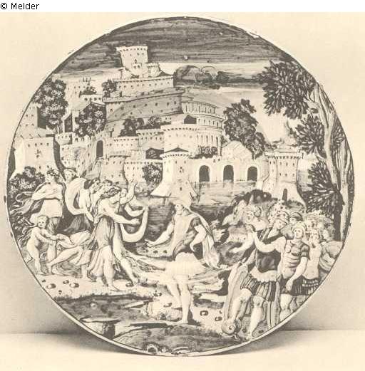 AN INTERESTING LARGE URBINO DEEP DISH, by Guido da Merlingo, painted in brilliant enamel colours with Coriolanus in front of Rome with his legionaries being pursuaded by his mother Vulumnia and his wife Vergilia, supported by the matrons of Rome to desist from attacking the city which is shown in the middle distance, in fine tones of orange, blue, yellow and green, the back of the dish inscribed " Coralliano (sic) quando vene p rovinare roma e p eli pregi de la matre fu placato" and in darker blue just below " Fate in botega da guido de merligno in Urbino ", within a yellow line border, circa 1540