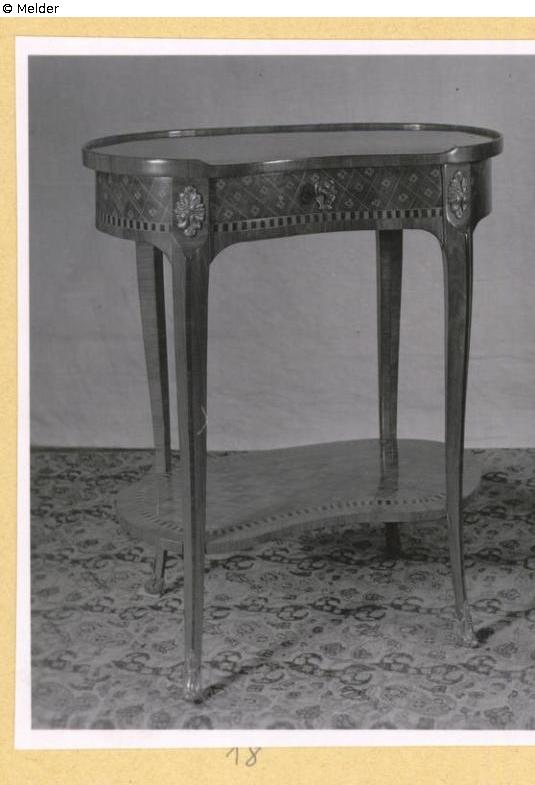 aus Rosenholz und Marquetterie. Louis XVI. Nierenförmige Platte, der etwa 20 cm über dem Boden eine zweite Platte zwischen den zierlichen, leicht geschwungenen Füßen mit Hohlkehlen entspricht. Die Füße stecken in Bronzeschuhen: am Zusammenschluß der Beine mit der Tischplatte ist je eine ovale Akanthusrosette aus vergoldeter Bronze angebracht. Ein Schubfach. Einlegearbeit in Rautenmuster, in der Mitte jeder Raute sitzt eine vierblättrige Blume. At ERR office on 54, Avenue d'Iena in the summer of 1942. An internal review by the ERR in Paris dated 15 April 1943 could not account for the location of this table.