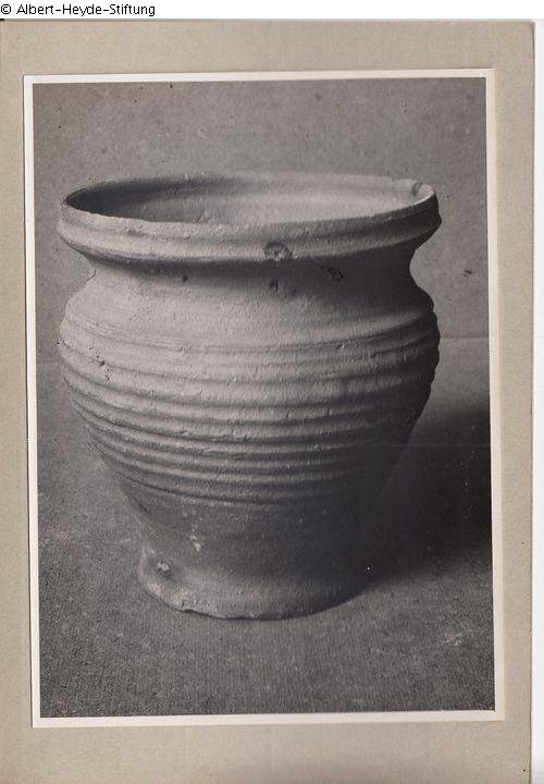Schwarzgrauer Topf mit profilierter Mündung und kräftig geriefeltem Bauch. Bodenfund. Topf mittelalterlich