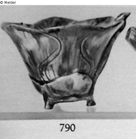 in Form einer Magnolienblüte, Becker (Becher), aus sechs Blättern gebildet. Grün, violett, gelb, weiß glasiert. Stengel zu drei Fußstümpfen ausgearbeitet;