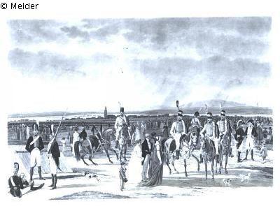 Der kolorierte Kupferstich entstand nach einem Gemälde von Wilhelm von Kobell. Im Vordergrund Infanterie mit Zelt, Husaren und andere Offiziere. Truppen der fränkischen Inspektion. Zivile Herren und Damen in der Bildmitte. Am unteren Rand signiert und datiert: "fecit Geissler, ... a Paris 1806".
