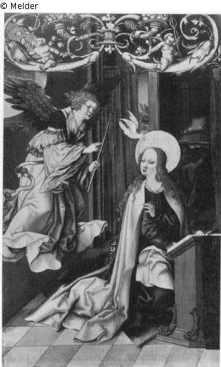 Tafelmalerei: Altarflügel: die Verkündigung: Maria sitzt; sitzen