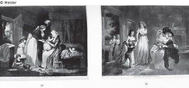 Ein Paar Gegenstücke: Vornehme Dame besucht ihr Kind bei einer Amme. - Dame besucht ihre junge Tochter, die von einer Lehrerin in das Zimmer geführt wird. Nach G. Morland. London, J. R. Smith. Gr.-Qu.-Folio.