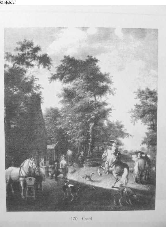 Vornehme Reiter mit Hunden rechts, links das Wirtshaus mit Staffagefiguren, Bäume im Hintergrund. Breiter Rahmen.