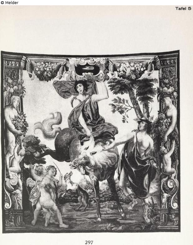 Merkur mit Reiter auf bockendem Pferd. Im Vordergrund zwei spielende Putten und Hund. Eingefasst von zwei Pfeilern mit Satyrpaar und Putten. Obere Abschlußborde in Form von Fruchtfestons mit großer Kartusche. Karton von Jac. Jordaens, Brüssel