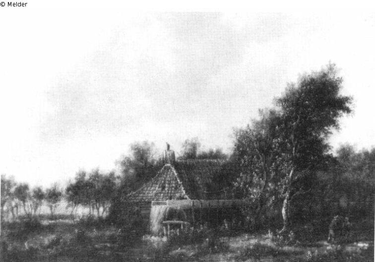 In the centre at forest¿s edge is a water mill, covered with a red tile roof. To the right beneath a high tree is a peasant with a girl.