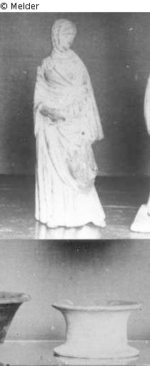 Frau im Chiton mit über den Kopf gezogenem Himation. Die Hände übereinander gelegt. Weisser Überzug, Reste von Violett. Dazu gehört eine runde, gekehlte Basis.