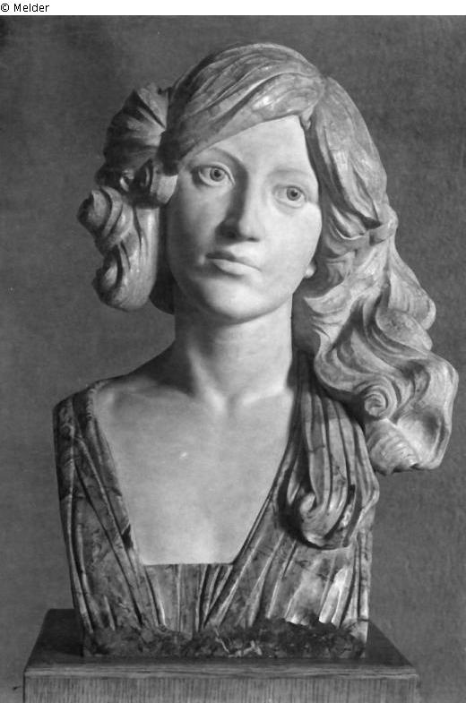 Der Kopf ist leicht nach der linken Schulter geneigt, die sehr vollen, gescheitelten Haare sind rechts zu Locken zusammengenommen, links fallen sie tief über die Schulter, auf der auch das Ende des umgelegten Mantels liegt.