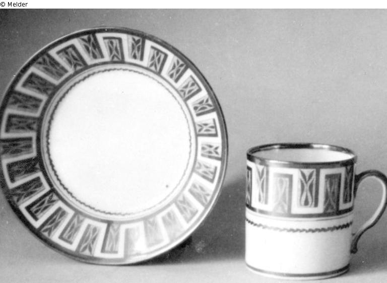 Becherform mit gebogenem Henkel und hoher Untertasse. Tasse geritzt L 6, Untertasse geritzt