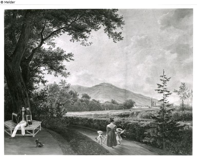 Im Vordergrund auf einer Bank Mann mit Fernrohr und auf dem Weg eine Frau mit Kindern. Gerahmt, signiert Joseph Feid 1830.