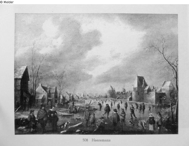 Eisvergnügen auf dem zugefrorenen Stadtgraben. Im Hintergrund rechts die Stadtmauer, links Häuser der Vorstadt. Goldrahmen.