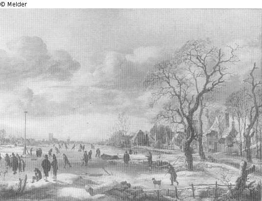 Tafelmalerei: Bild: menschliche Tätigkeiten im Winter (bei der Einteilung des Jahres in vier Jahreszeiten) : Wintersport; Winter; Tätigkeiten : Winter; Wintersport; Schnee; Eis(-decke, -schicht); Bez. unten links; Signatur: AV (verbunden) DN (verbunden); Maße: 59 x 82 cm