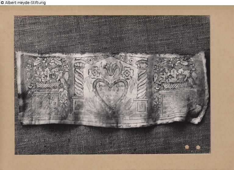 Rechteckiges Lederband, bedruckt und koloriert. Außen jeweils Altar mit Inschrift, darauf ein Blumenkorb. In der Mitte eine Arkade mit tordierten Säulen, darin ein Blütenherz mit der Widmung: "Zum An / denken der / Freund / schaft".