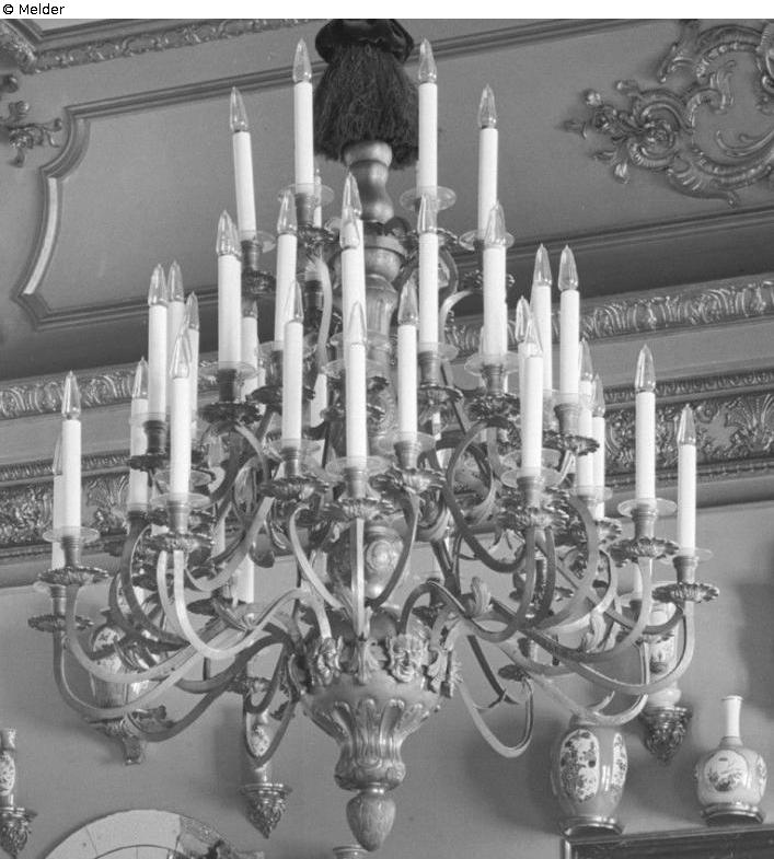 Dresdner Schloss, Paraderäume; Im Inventarverzeichnis Nr. 1 vom 31.01.1920, als Bestandteil des Auseinandersetzungsvertrages des Freistaates Sachsen und dem vormaligen Königshaus von 1924 aufgeführt, welche als rot angekreuztes Rauminventar dem Staat zufallen; Die beiden Kronleuchter aus dem Ersten und Zweiten Vorzimmer (Kaffeezimmer) wurden entweder bereits am 13.04.1944, spätestens mit dem zweiten Transport am 21.04.1944 nach dem Bergungsort Rittergut Brauna bei Kamenz ausgelagert. Die Kronleuchter des Eckparadesaales kamen am 27.04.1944 nach Schloss Zottewitz. Sie wurden im Keller des Hauptgebäudes untergebracht, der große Mittelleuchter kam in die Garage des Wirtschaftsgebäudes. Zu den Verlustumständen dieser Objekte ist nichts bekannt. Ein Verlust im Zusammenhang mit den Ereignissen des 2. WK wird vermutet.