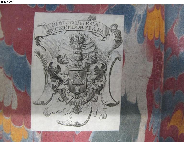 on pastedown in black: 28; label: VII. a 28 [inventory number of the library Seckendorff in Meuselwitz]; on the front pastedown a lable: Bibliotheca Seckendorfiana; on the flyleaf with pencil: cc hl; NS-Gut [?]; 1 Bl., 108 SS, 1 Bl; in brown: B 11 gl: