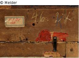 Auf der Rückseite befindet sich ein Rest von einem roten Siegel: „Oggetti d’Arte….Truz…..Antichita“ (schwer lesbar). Darunter sind jeweils Papierreste erkennbar. Die Siegel befinden sich sowohl auf dem Keilrahmen als auch auf dem Zierahmen. Sie scheinen auf einen Vorbesitzer in Italien zu verweisen.