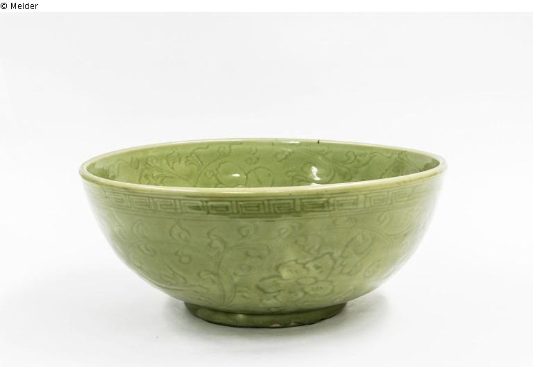 Red-brown fired stoneware, olive-green celadon glaze; inside on the mirror the sign for 'happiness' is embossed in small seal script