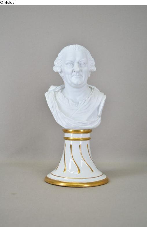 Bust of bisque porcelain; base of porcelain with gold decoration; embossed mark on the back of the bust: "W" under a horse jumping to the left (1771-1794), below "No. 42"; on the inside respectively underside of the base mark of the porcelain manufactory Fürstenberg "F" in underglaze blue as well as embossed mark underglaze "10.G"; furthermore handwritten inscription "Fürstenb. Nr. 1b" (old number of the Bomann Museum) as well as two paper stickers with blue frame and handwritten inscription "411" (large sticker) and "249" (small sticker).