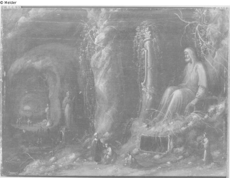 On the front left, to the side of an entrance to the grotto, on a slight rise stands a far larger than life grey female robed statue; in front of it sits a woman with flowers; to the right of her stands an old man with a turban. In the depths of the grotto, which divides into two naves at the back, numerous figures.