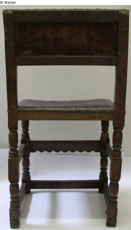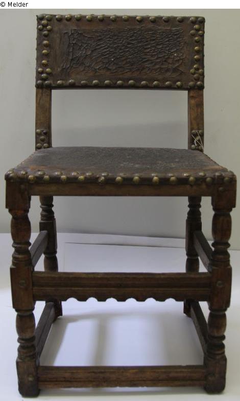 On four partly twisted legs with three thickenings, braced together with profiled boards; rectangular seat with old leather upholstery, which is fastened here as well as on the upper half of the backrest with large round brass buttons
