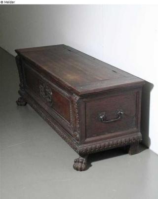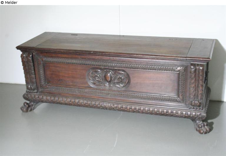 Inventory book entry 5.9.1952: Box chest, dark stained, walnut box framed with carved ledges on the front, carved medallion in the middle. Carved claw feet. Badly damaged.