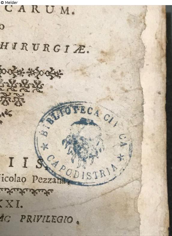pars prima - secunda; edition of 265: Nr. 35; on front pastedown with pencil: KO VII 67; 256 [in a triangle]; stamp on the titlepage in blue: Bibliotheca CI[VI]Ca Capodistria [ca. 27 x 35 mm]