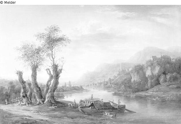Signatur: Schütz f.; Flußlandschaft, im Vordergrund 2 Schiffe und ein Boot vor Anker.Links Kopfweiden.Hintergrund Berge, am Fuß eine kleine Stadt.Beschriftung auf dem Rahmen trägt falsches Beburtsdatum (1718 statt 1708). Rückseite r.o. Aufkleber teilweise abgerissen : "Christian Georg Schütz geb 17 Sept. 1708 gest. 6. Nov 1791 (statt Signatur ?).Holztafel durch 2 horizontale Parkettleisten verstärkt.