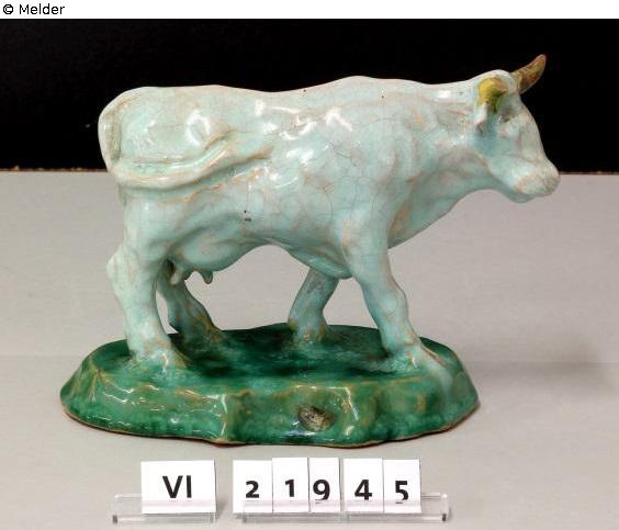 Animal sculpture Cow, design and manufacture Emil Potter (1872-1927). Cow standing on irregularly shaped plinth. Cow glazed light green, red shards translucent, horns glazed yellow, plinth glazed dark green.