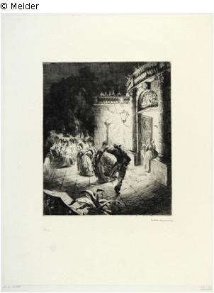 Found-Object Report | Object report The dance on the castle terrace Lost Art-ID429485 Previous Next Artist / Creator Schultheiß, Karl Max Birth 1885.08.04, Nürnberg Death 1944.01.23 / 1961.11.09, New York / Kew Gardens (New York) / München Place of activityNürnberg; München TitleThe dance on the castle terraceObject typePrintGroup of reported objectsGraphicMaterial / TechniquePaper / printed (etching) Height 24.80 cm Width 20.80 cm Inventory numberA 1936-154Provenance according to the inventory book of the Dresden Cabinet of Prints: Transferred by the Ministry of the Interior Read more Read less Published since15.02.2011 Contact Staatliche Kunstsammlungen Dresden Kupferstich-Kabinett Taschenberg 2 01067 Dresden Germany Phone(0351) 4914 3210E-Mailkk@skd.museumHomepagehttps://www.skd.museum Contact DirektionPhone(0351) 4914 3210E-Mailkk@skd.museum