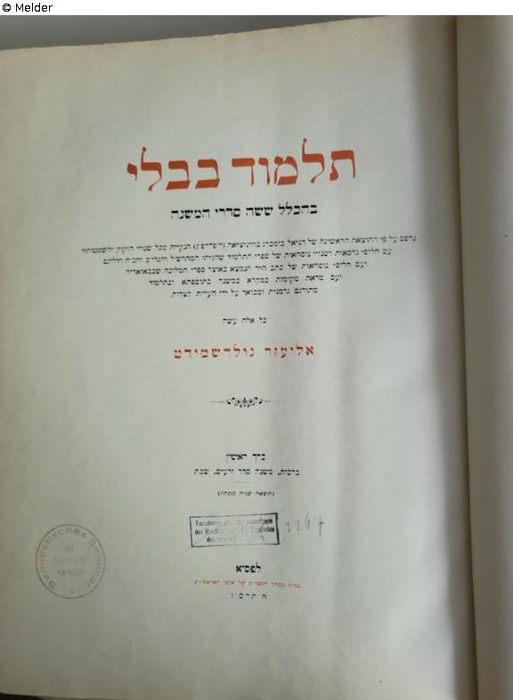 Found-Object Report | Object report Der Babylonische Talmud mit Einschluss der vollstaendigen Mišnah. Erster Band. Lost Art-ID632697 Previous Next Editor Goldschmidt, L. Publisher Harrassowitz TitleDer Babylonische Talmud mit Einschluss der vollstaendigen Mišnah. Erster Band.Place of releaseLeipzig Date of publication1906Object typeBookGroup of reported objectsLibrary objectsSignature1207/Hg 201 (1Description stamp "Forschungsabteilung Judenfrage des Reichsinstituts für Geschichte des neuen Deutschlands" (T687/3367 ). Read more Read less Published since28.10.2025 Contact Ludwig-Maximilians-Universität Institut für den Nahen und Mittleren Osten Bibliothek Veterinärstr. 1 80539 München Germany Phone0049-89-2180-3039Homepagehttps://www.naher-osten.uni-muenchen.de/institut/bibliothek/index.html Contact Prof. Dr. Ronny VollandtPositionProfessor für JudaistikE-Mailronny.vollandt@lmu.de
