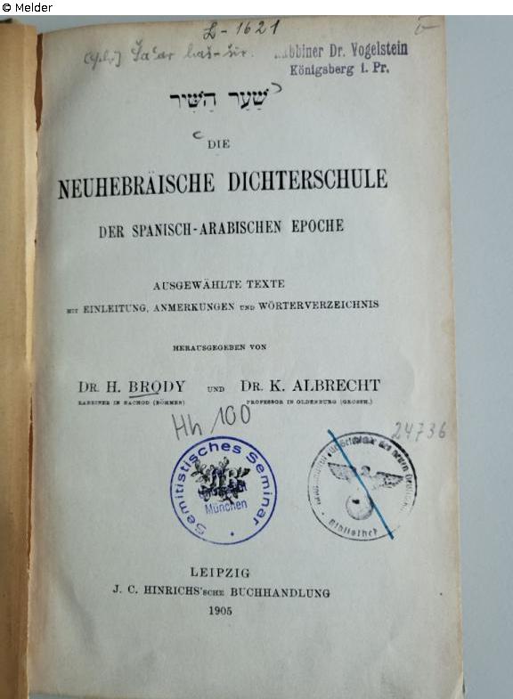 Ownership stamp: Rabbi Dr. Vogelstein Königsberg i. Pr. (probably from the collection of Hermann Vogelstein (1870-1942), who was rabbi in Königsberg from 1897 to 1920 and emigrated in 1938, having to leave his entire library behind.