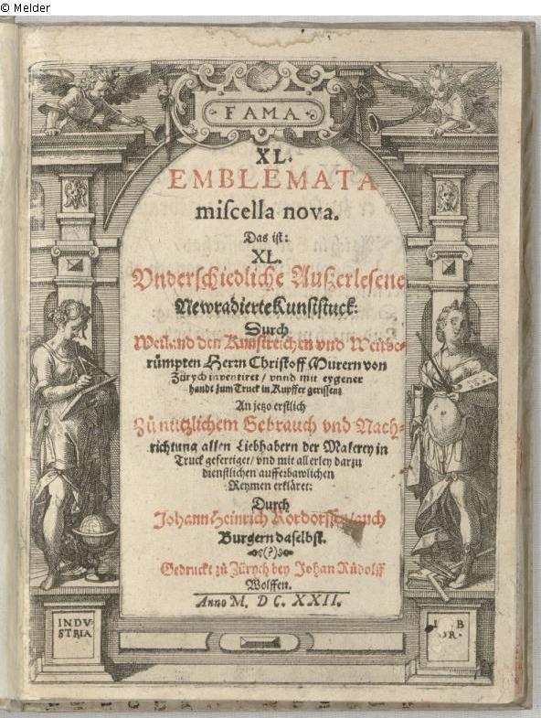Title page: "XL. EMBLEMATA miscella nova. Das ist: XL. Vnderschiedliche Auszerlesene Newradierte Kunststuck: Durch Weiland den Kunstreichen und Weitberuemten Herrn Christoff Murern von Zürych inventiret / unnd mit eygener handt zum Truck in Kupffer gerissen: An jetzo erstlich zu nutzlichem Gebrauch und Nachrichtung allen Liebhabern der Malerey in Truck gefertiget / und mit allerey darzu dienstlichen ausserbawlichen Reymen erklaeret: Durch Johann Heinrich Rordorffen / auch Burgern daselbst. Gedruckt zu Zürych bey Johan Rudolff Wolffen. Anno MDCXXII"