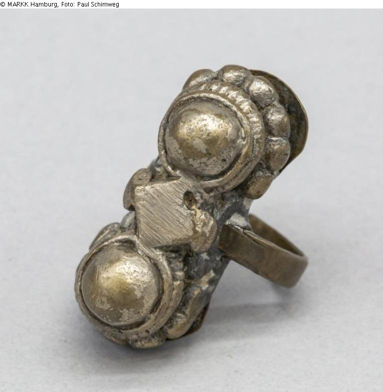 Finger ring with elongated plate and double dome decoration, surrounded by granulated pearls. Open finger ring. A small decorative plate between the buttons. Base plate open at the side. Ring and technique suggest origin from Rajasthan/India.