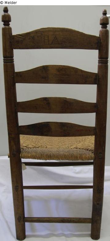 Twisted legs, braced on all sides with two round rungs, four curved rungs on the backrest Seat trapezoidal, woven from reed. Backrest: top rung, burned: "HA"