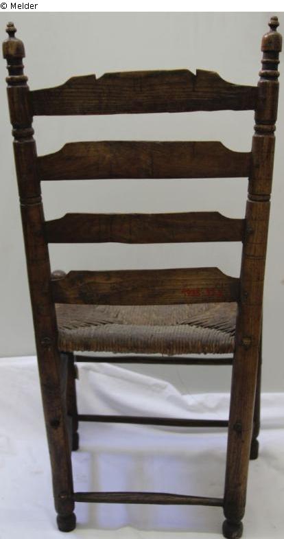 On four round legs, which are braced together with seven (at the back only one) round rods. Trapezoidal braided seat. Backrest: between two round posts which slope slightly outwards and end in a turned knob, four horizontal curved boards