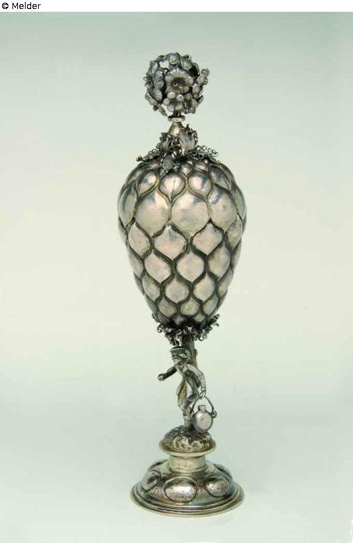 Splendid vessel with drinking cup (Kuppa) and lid in the form of a bunch of grapes: over the arched, surrounded by scattered humps round base with stepped stand, indentation and plate is a male carrier figure with handle bottle in hand (represents a winemaker with hat and bottle, walking stick in the right hand is missing), which serves as a shaft of the vessel; on the head the figure carries the egg-shaped Kuppa; the connecting link is a tree trunk with scrolled foliage; the lid is crowned by a bouquet of flowers.