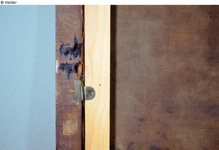 Landscape with different figures. In the foreground women washing their clothes. On the left side a rock with a waterfall. Through the leafy trees on the right side view to a place with a church tower. On the back with yellow chalk written the auction number of Hans W. Lange (69) and remains of two old labels. At the top of the ornamental frame two more numbers written with chalk, probably 327 and 200. Counterpart to BM00761/ST.