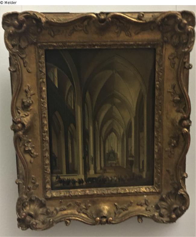 View into the side aisle (?) of a strangely built Gothic church: on the left a very narrow aisle with a clerestory (central nave?). In the foreground on the right a grave has been dug, to which a funeral procession is moving.