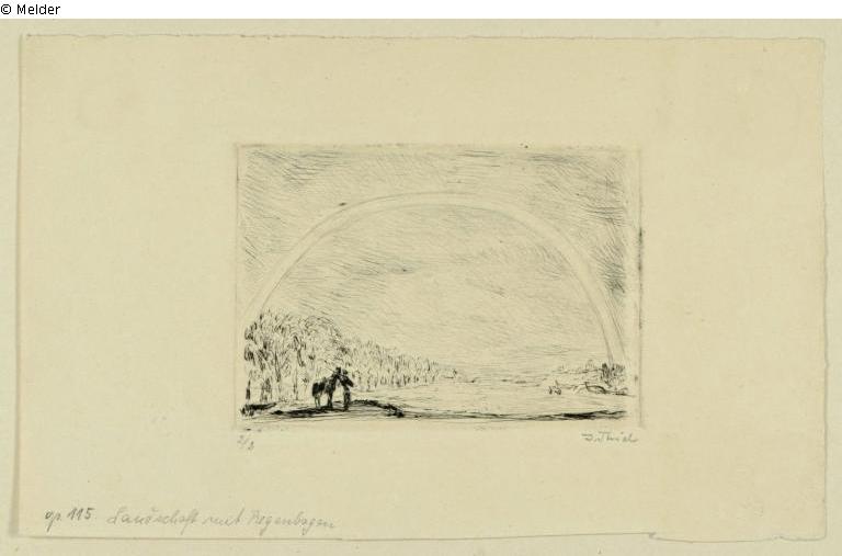 Numbering lower left "2/2"; in pencil designated lower right "J. Thiel". pencil note at lower left margin of the front page "op. 115 Landschaft mit Regenbogen". Under passepartout typewritten with the title of the work on the left and the artist's name on the right.