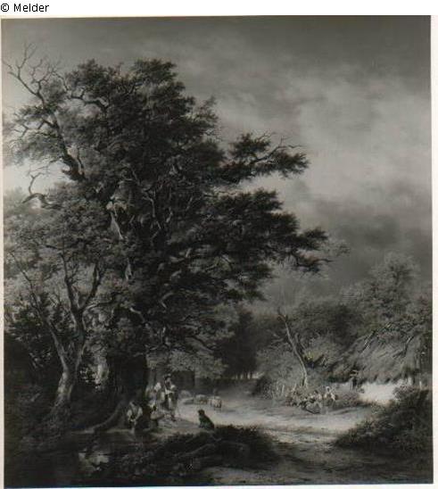 Tall tree left, in front of a creek. On a tree farm girl sitting with bare feet. Sitting and standing shepherd looking at a dog. To the right of way farmer's wife in front of a Cottage. Sheep on the road.