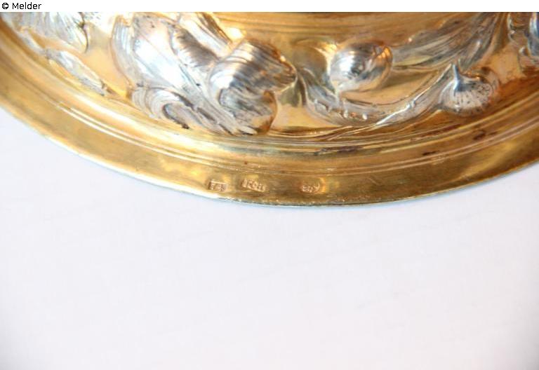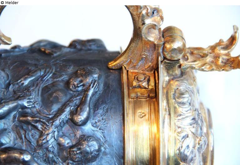 The vessel is closed by a domed lid with a flared rim. The bead is decorated with floral relief. The lid was attached to the top of the S-shaped handle of the hump with a hinge. The handle and split thumb rest are worked in cartilage moulds. The letters "OAS" are incised twice under the base, as well as the inventory number "AB 1079" and four jagged lines. The master's mark and the hallmark are located on the lip rim.