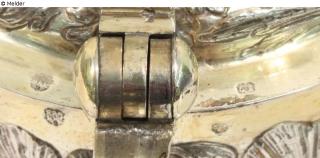 The partially gilded silver tankard has a cylindrical body and a domed round foot with a flared stand ring. The vessel is closed by a domed lid with a flared rim and baluster knob. The lid is hinged at the top to the canted, slightly S-shaped handle. There is also an antler-shaped thumb rest on the hinge.