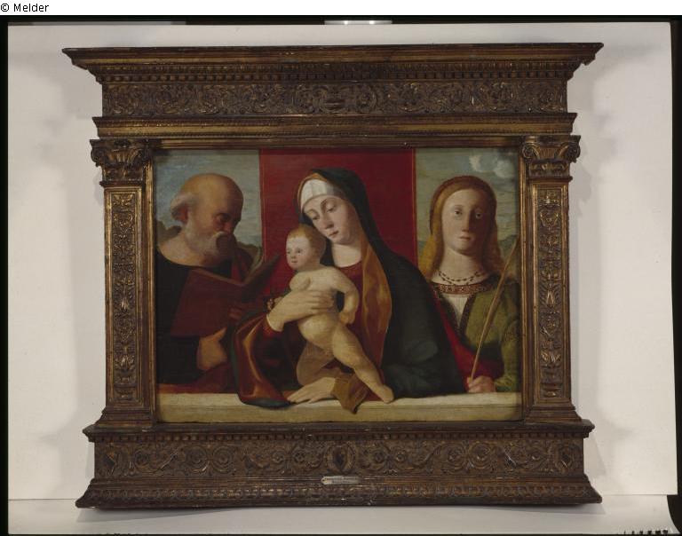 Virgin Mary standing behind a parapet with the naked child, to the left a male saint with a book and to the right a female saint with a palm twig