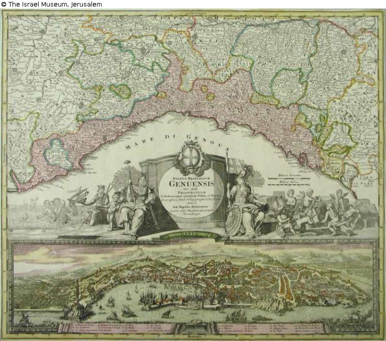 Found-Object Report | Object report A Map of the Republic of Genoa (Status Republica Genuesis) Lost Art-ID572938 Previous Next Link to item in IMJ siteLink to the main site Artist / Creator Homann, Johann Baptista LebensdatenGermany, ca. 1664–1724 TitleA Map of the Republic of Genoa (Status Republica Genuesis) DatingUndatedObject typePrintGroup of reported objectsGraphicMaterial / TechniqueHand-colored etching on paper Height 48.80 cm Width 62.00 cm Inventory numberB52.11.1909Description Object Name: Print Read more Read less Provenance Received through JRSO (Jewish Restitution Successor Organization)JRSO Number: 21835/1 Provenance: Grohlke Read more Read less Published since10.01.2018 Contact Israel Museum POB 71117 9171002 Jerusalem Israel Phone972-2-6708811Fax972-2-5631833E-Mailinfo@imj.org.il Contact Bareket MannPositionRegistrarE-Mailbareket@imj.org.il
