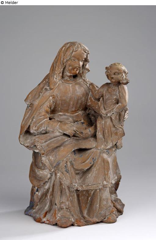 Full plastic group of reddish clay. On the left knee of the sitting Virgin Mary stands the blessing boy Jesus, whom she supports with her left hand, while her right hand reaches into the cloak lying on her lap. Mary with a girdled robe, headscarf and cloak with fringed hem.